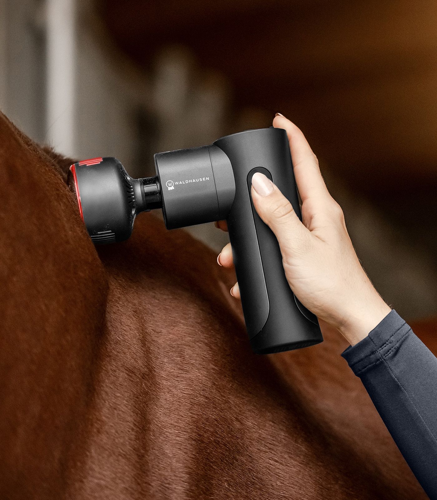 Das Waldhausen Health + Care Massagegerät Pro ist speziell für die Anwendung bei Pferden konzipiert, um deren Regeneration und Wohlbefinden zu fördern.